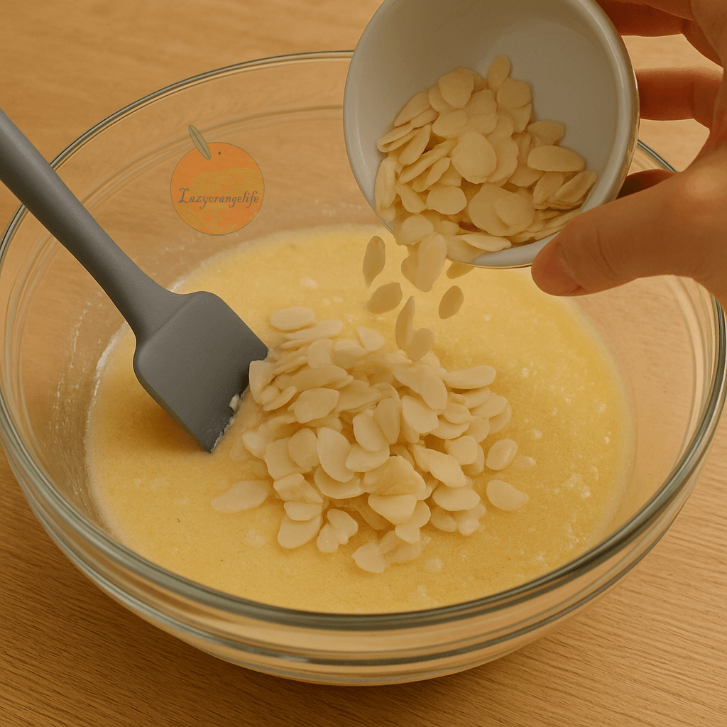 倒入杏仁片,用刮刀或湯匙輕柔拌勻,避免杏仁片斷裂。
