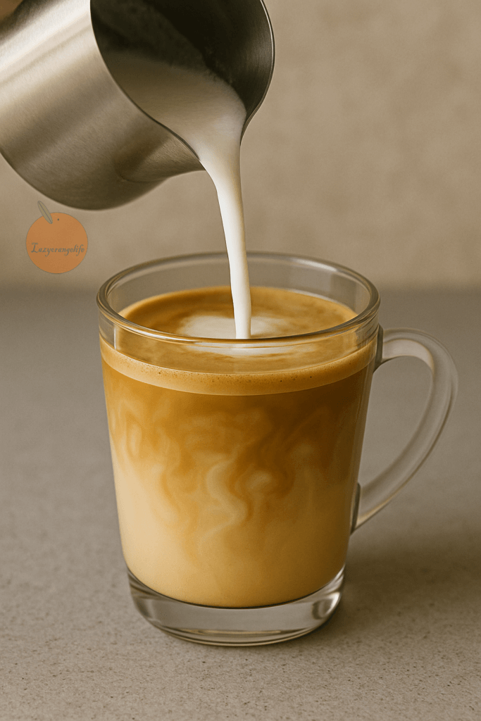 將熱牛奶倒入黑糖漿中,攪拌均勻。