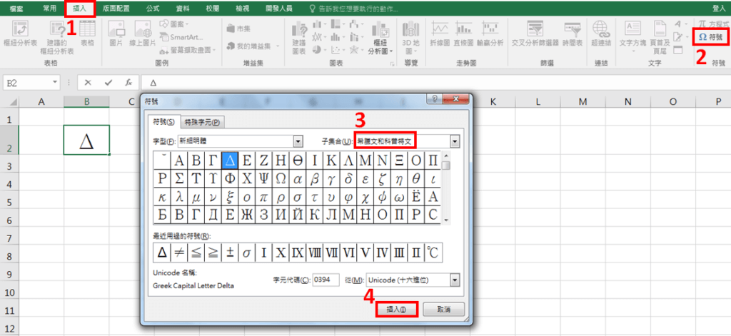 點選「插入」-「符號」,選擇子集合「希臘文和科普特文」,即可看到「Δ」符號,選取後再點選「插入」。