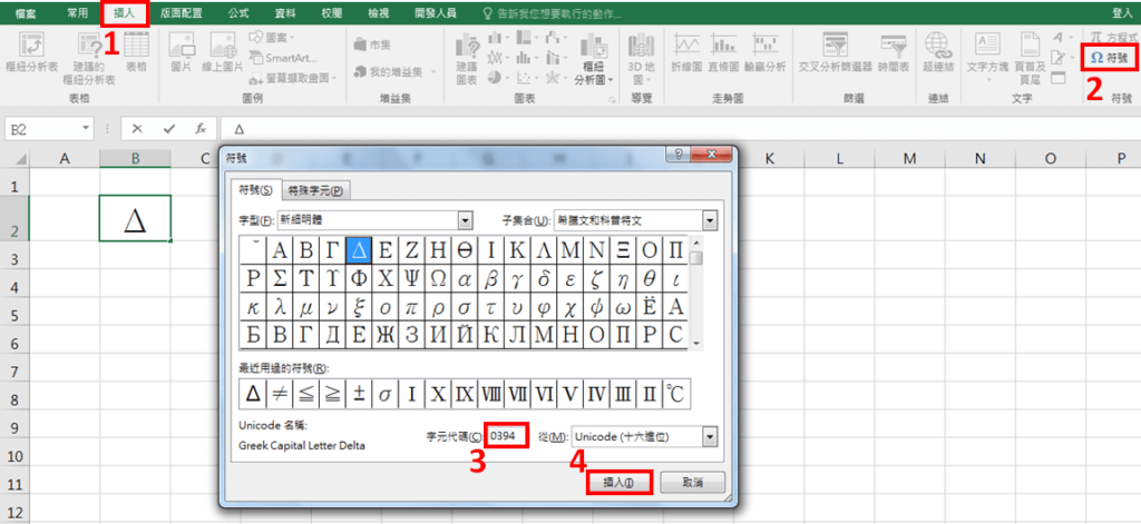 點選「插入」-「符號」,字元代碼輸入「0394」即為「Δ」符號,再點選「插入」。