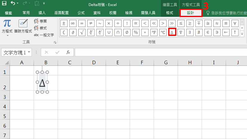 點選「插入」-「方程式」,接著於「方程式工具」-「設計」,即可看到「Δ」符號,點選即插入。