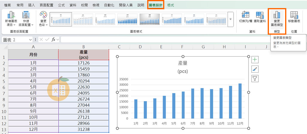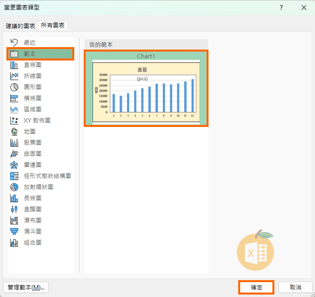 3️⃣ 在要套用樣式的圖表上,前往【圖表設計】→【變更圖表類型】→【範本】分頁 → 選擇你剛儲存的樣式並套用