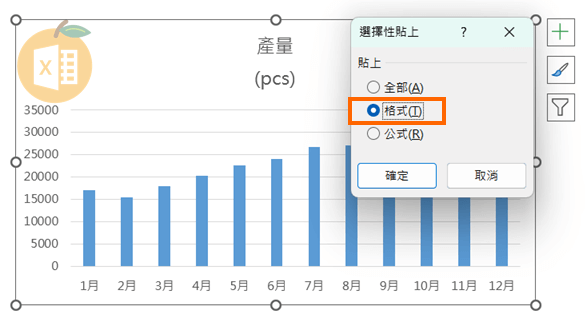 - 僅會複製圖表的外觀格式,如顏色搭配、字型樣式、圖例位置、資料標籤設定等