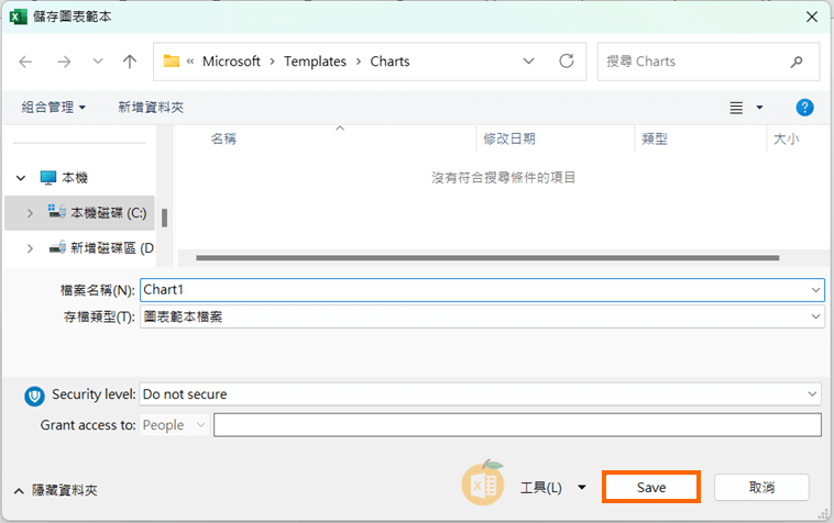 2️⃣ 輸入檔名(例如:Chart1) → 儲存後 Excel 會自動將檔案儲存在「圖表範本」資料夾中(副檔名為 .crtx)