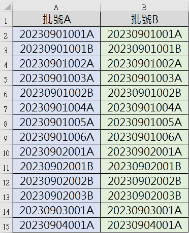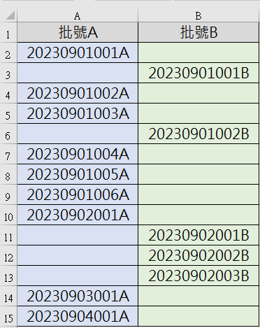 先將A欄資料複製到B欄,以區分出尾數「A」與尾數「B」。