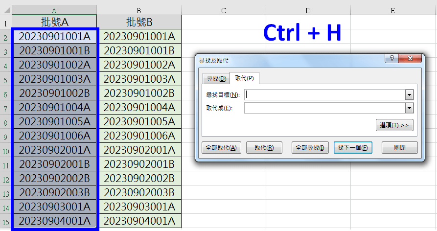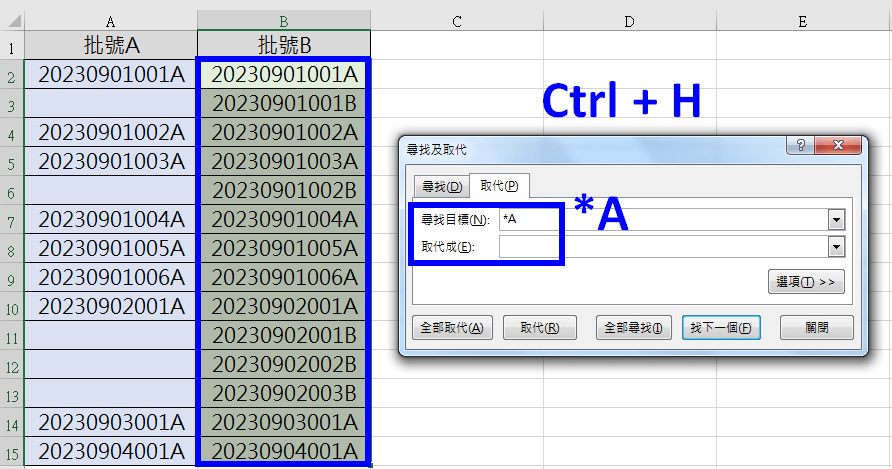 框選尾數「A」資料(A欄),按下快捷鍵「Ctrl」+「H」取代功能。