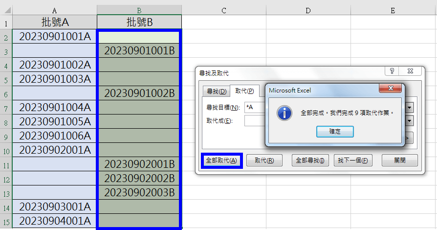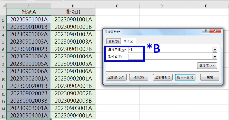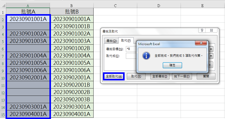 點選「全部取代」,將A欄之尾數「B」資料去除,尾數「A」資料保留。
