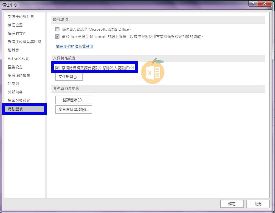 點選「隱私選項」,將「文件特定設定」-「存檔時自檔案摘要資訊中移除私人資訊」的勾選取消。