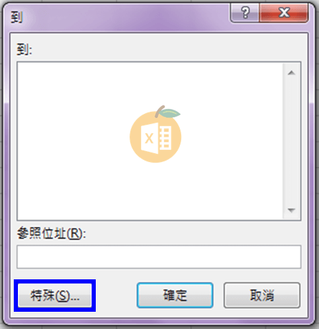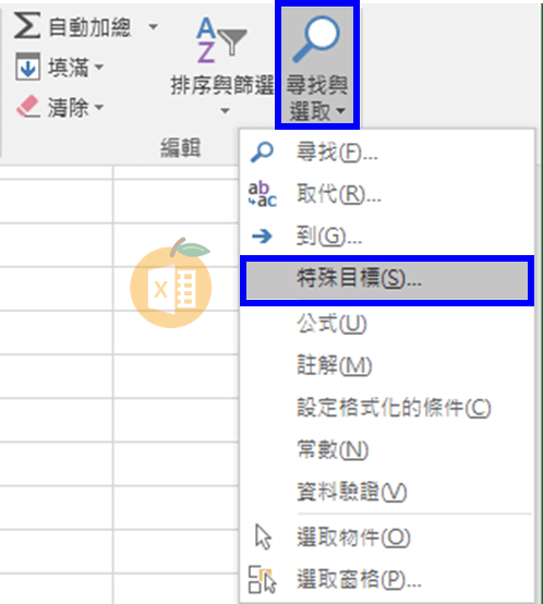 點選「常用」>「尋找與選取」>「特殊目標」,或是使用快捷鍵「Ctrl」+「G」到>「特殊目標」。