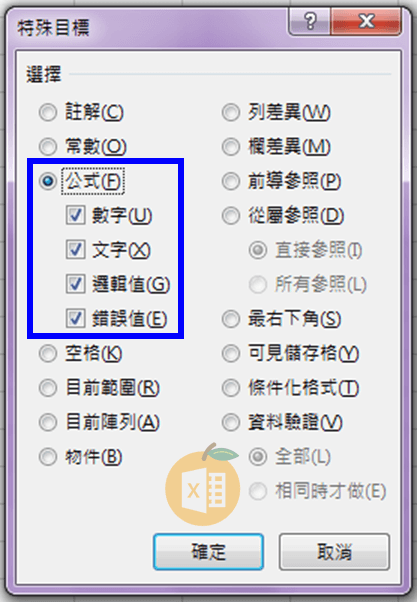特殊目標選擇「公式」,並根據類別選擇下方的任何複選框。