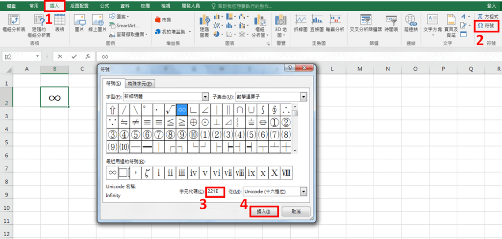 點選「插入」-「符號」,字元代碼輸入「221E」即為「∞」符號,再點選「插入」。