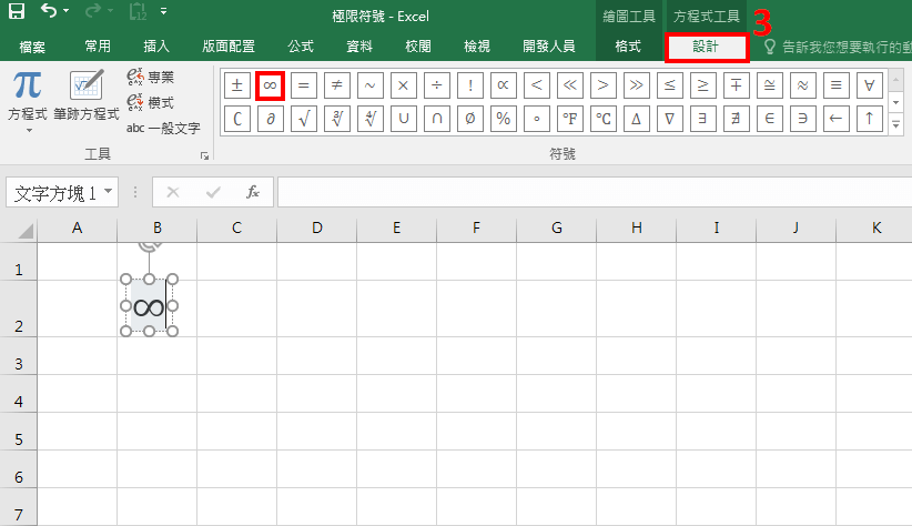 點選「插入」-「方程式」,接著於「方程式工具」-「設計」,即可看到「∞」符號,點選即插入。