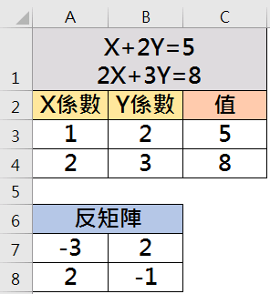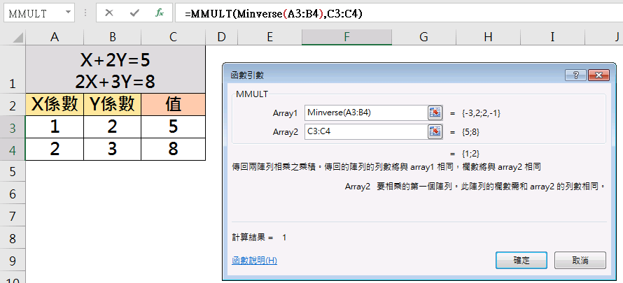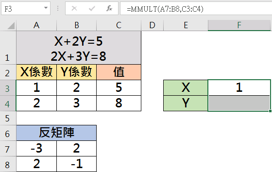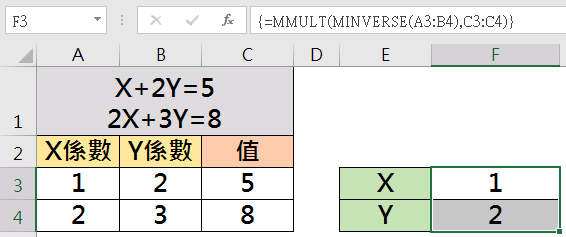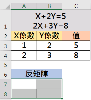 所以接下來就是利用Excel的矩陣函數運算來解二元一次方程式。