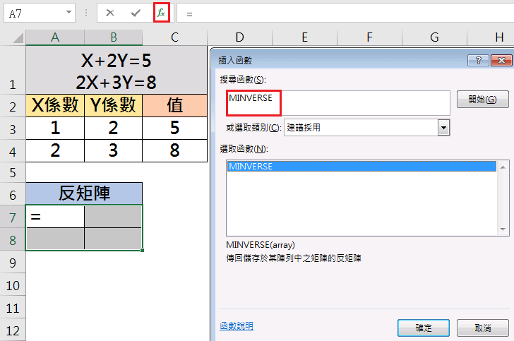 框選2列2行的儲存格如「A7:B8」,點選插入函數f(x)-「MINVERSE」函數。