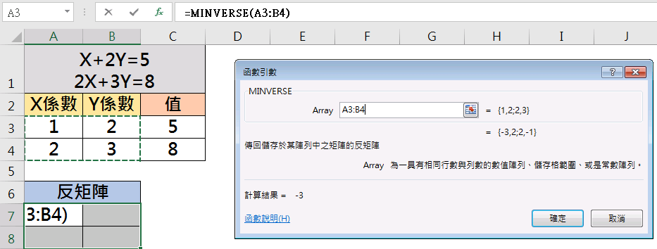 Array1:計算「A3:B4」的反函數,即「Minverse(A3:B4)」。
