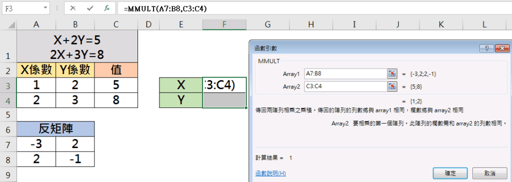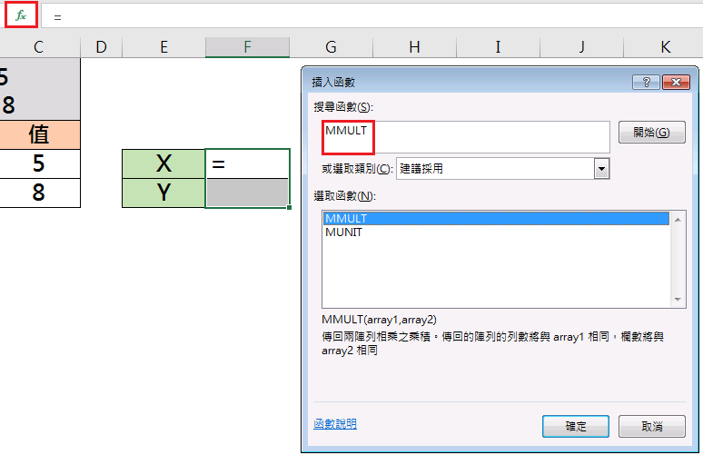 因X陣列為兩列一行,選取兩列一行之儲存格如「F3:F4」,點選插入函數f(x)-「MMULT」函數。