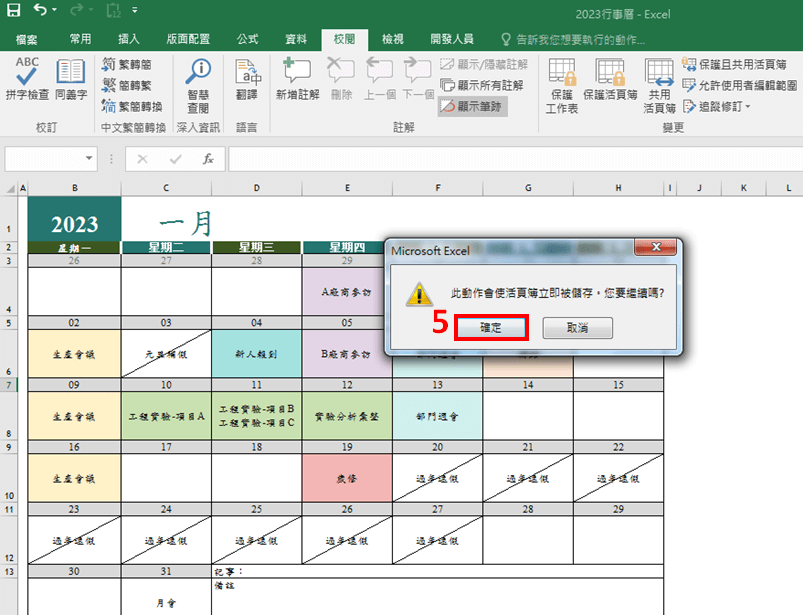 會跳出「此動作會使活頁簿立即被儲存,您要繼續嗎?」,點選「確定」。