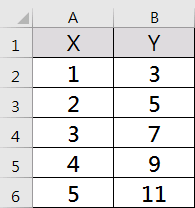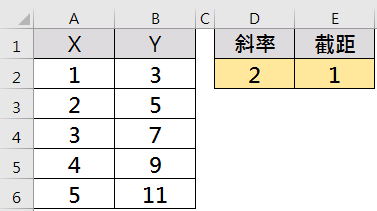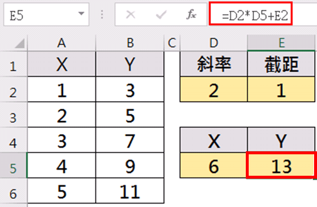 求得直線方程式y=2x+1,則代入Y=斜率*X+截距,E2儲存格公式則為如下:
