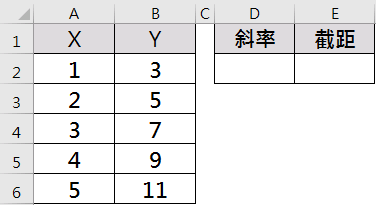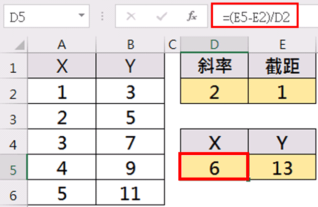求得直線方程式y=2x+1,則代入X=(Y-截距)/斜率,D2儲存格公式則為如下: