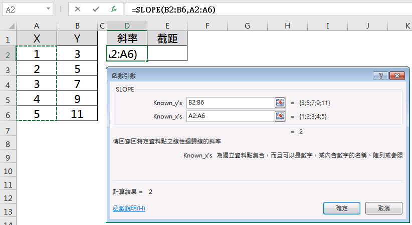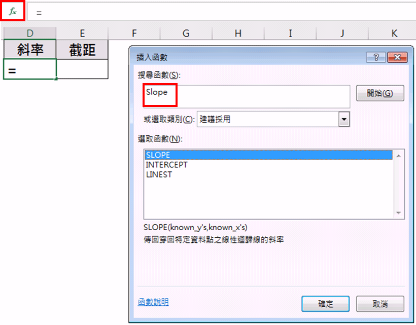 於斜率儲存格(D2)插入函數(fx)-「Slope」函數。