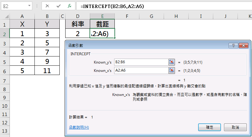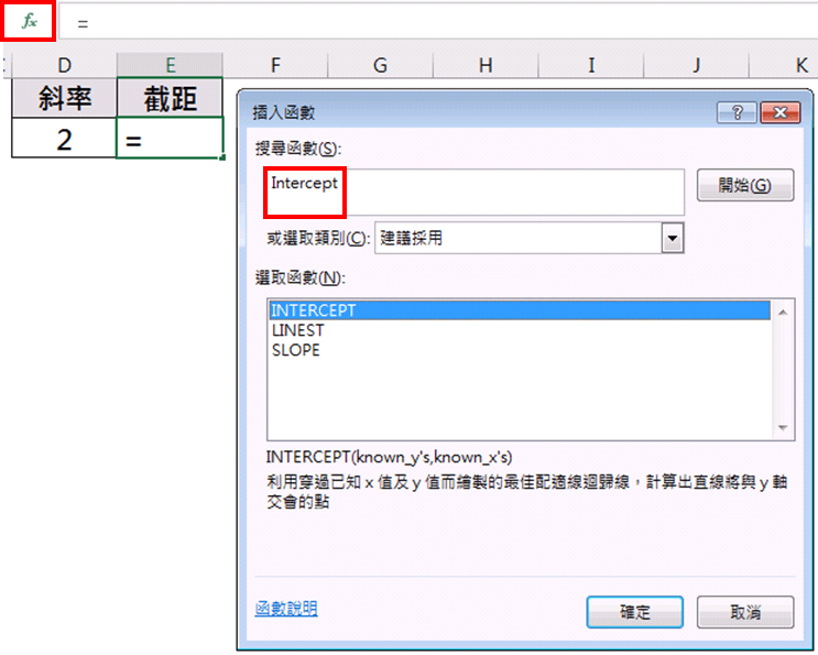 於截距儲存格(E2)插入函數(fx)-「Intercept」函數。