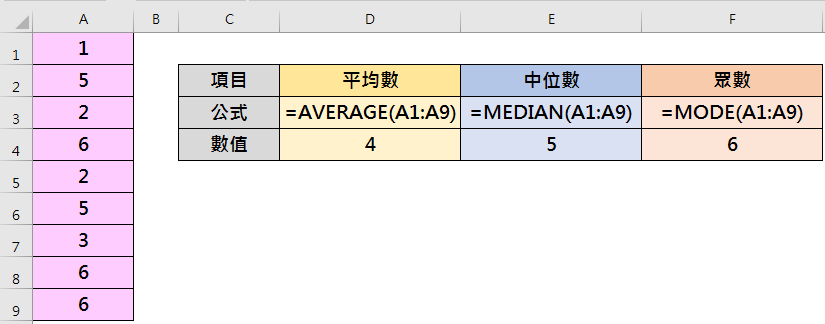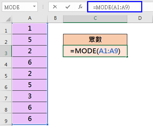 使用「MODE」函數,如計算「A1:A9」儲存格之眾數則輸入以下