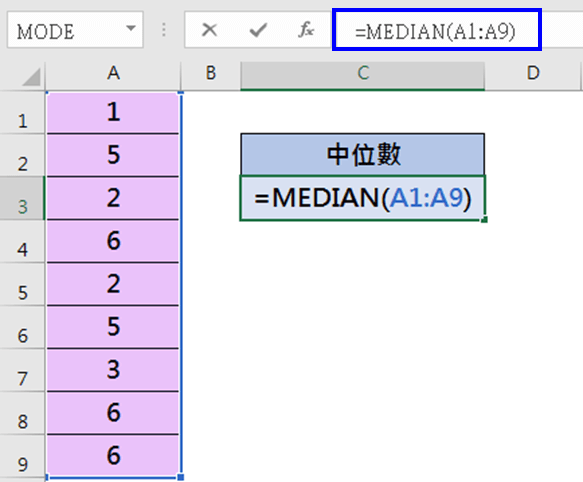 使用「MEDIAN」函數,如計算「A1:A9」儲存格之中位數則輸入以下