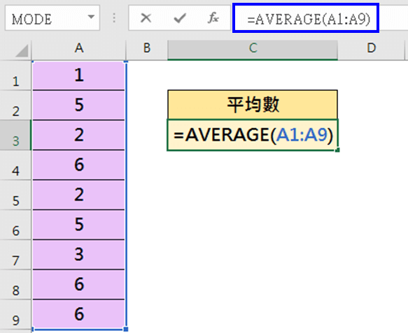 使用「AVERAGE」函數,如計算「A1:A9」儲存格之平均數則輸入以下