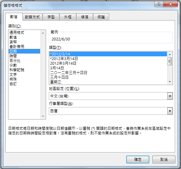 Ans:可以在加上「語言格式」,如「英文(美國)」則輸入「[$-409]」或「[$-en-US]」;「繁體中文(台灣)」則為輸入[$-404]或「[$-zh-TW]」。