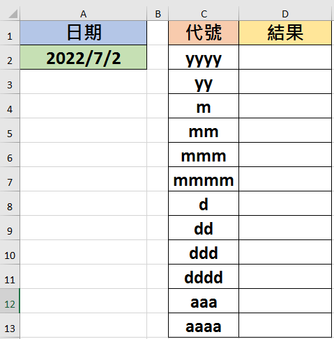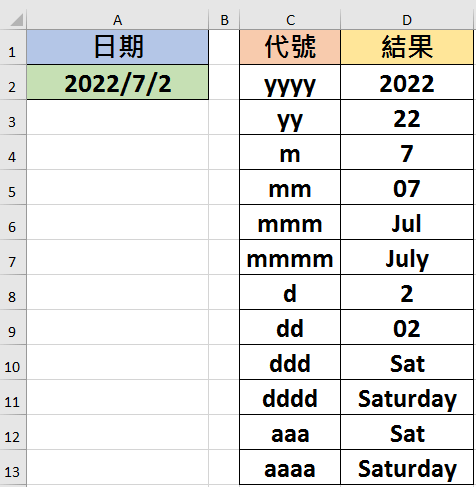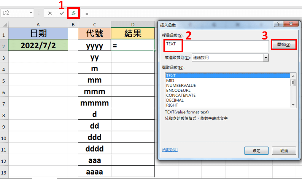 「TEXT」函數需使用「格式符號」,而日期的格式符號如下: