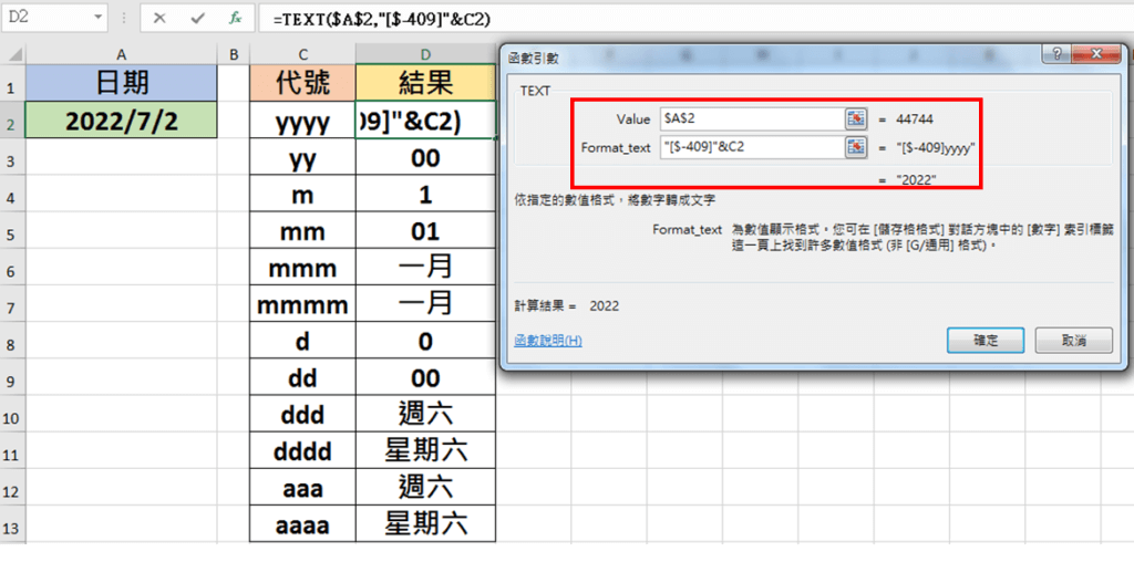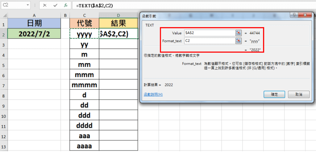 Format_text:選擇要顯示的格式符號,如「C2」儲存格即「“yyyy”」。