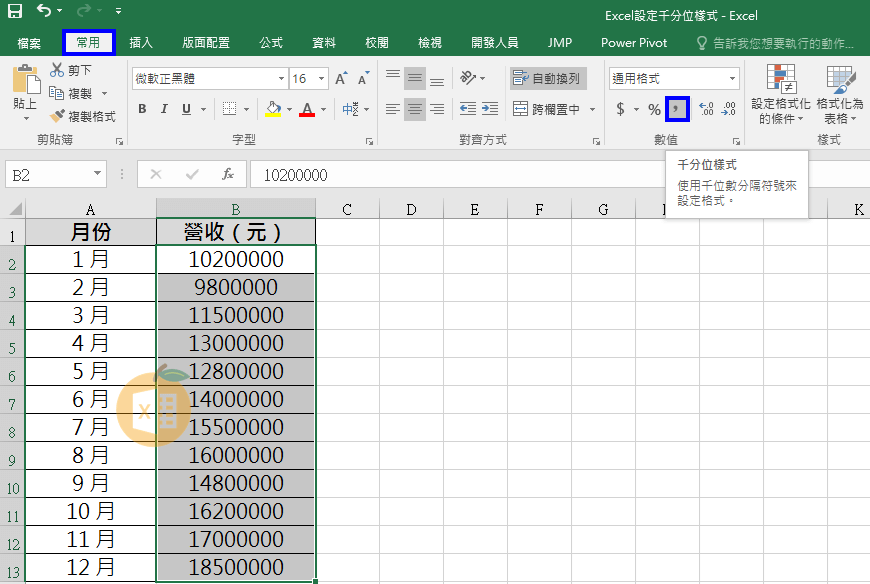 - 套用逗號樣式:在 Excel 上方功能區點選【常用】→【數值格式群組】→按下「逗號樣式」(圖示為