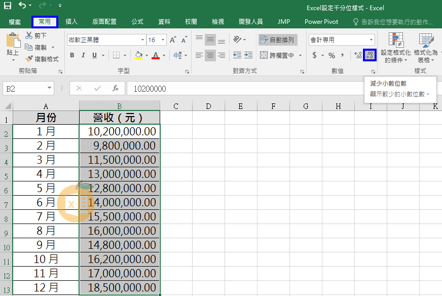 - 減少小數位數:若你只想顯示整數或減少小數位數,可點選【減少小數位數】按鈕(圖示為左箭頭與小數點),每按一次就會減少一位小數,直到只剩整數。
