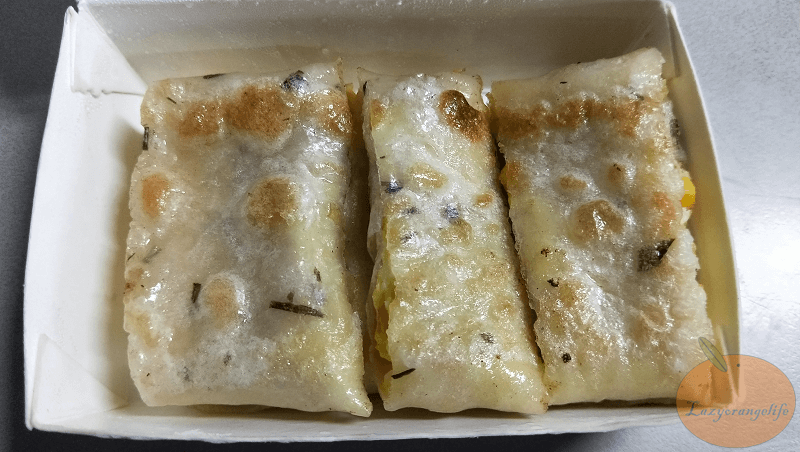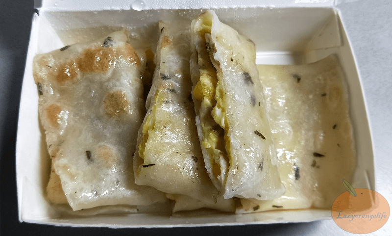雖然這一道餐點有「★」符號,也有些網友覺得餅皮不錯,但Orange吃完覺得普普通通,一來是餅皮煎得不夠酥脆,其二是玉米放的太少了,才幾粒玉米卻要比原味蛋餅多花$10,不太划算。
