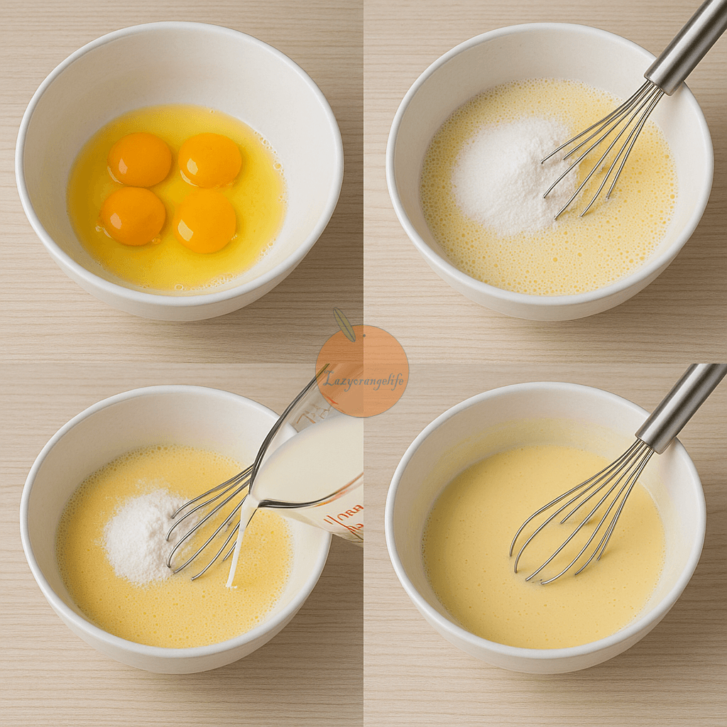 - 倒入牛奶、鮮奶油與香草精拌勻。