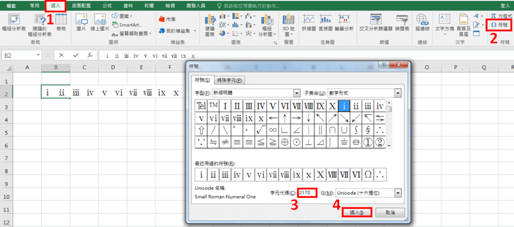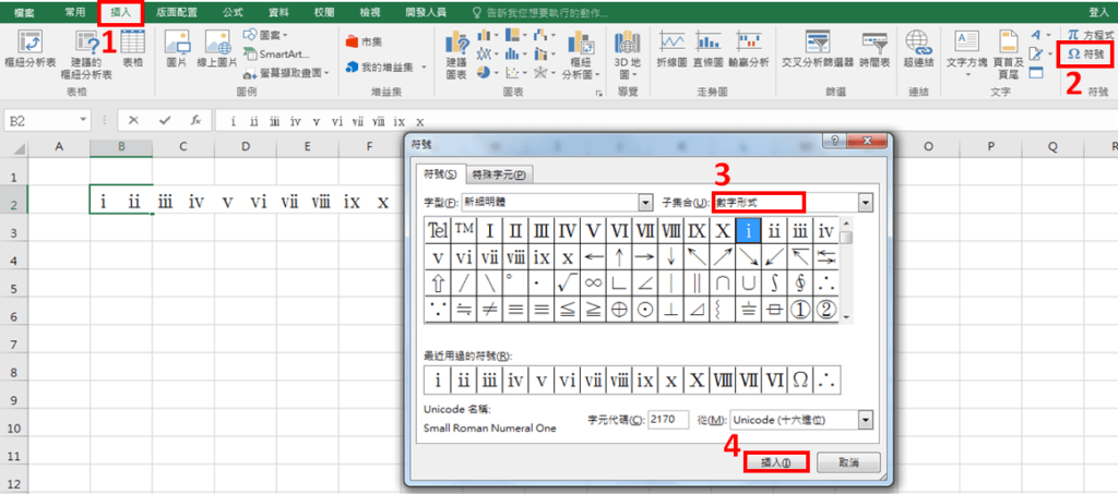 點選「插入」-「符號」,選擇子集合「數字形式」,即可看到「ⅰ~ⅹ」符號,選取後再點選「插入」。