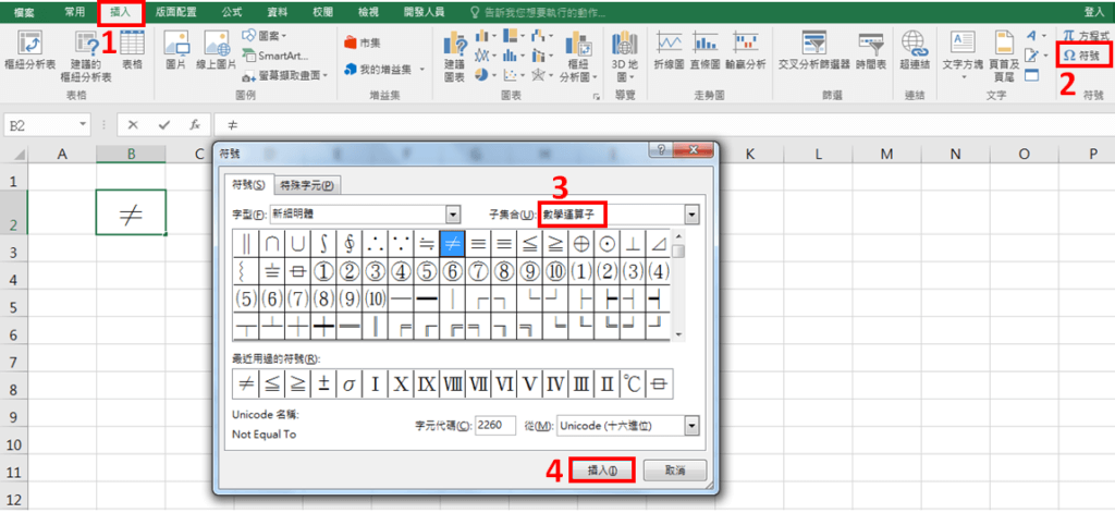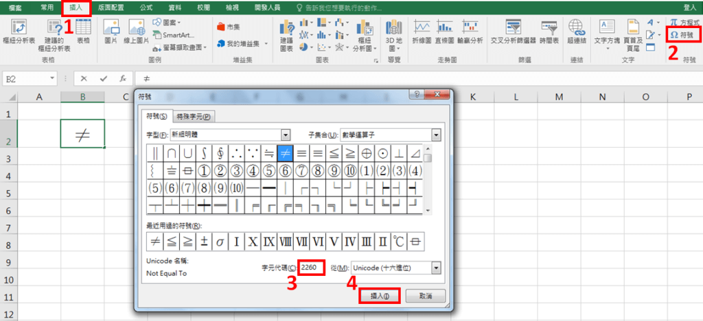 點選「插入」-「符號」,字元代碼輸入「2260」即為「≠」符號,再點選「插入」。