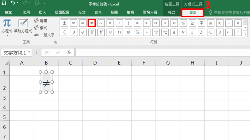 點選「插入」-「方程式」,接著於「方程式工具」-「設計」,即可看到「≠」符號,點選即插入。