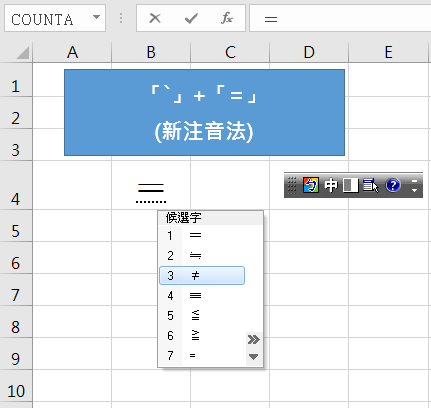 選取「新注音」輸入法,並按下「`」+「=」,此時「=」符號下方出現「……」,接著按下鍵盤「↓」篩選候選字,選取「≠」符號即變更。