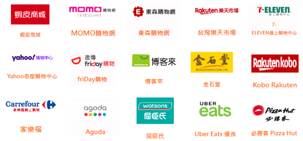 蝦皮商城、MOMO購物網、東森購物網、台灣樂天市場、7-11線上購物中心、Yahoo奇摩購物中心、遠傳Friday購物、博客來、金石堂、Kobo Rakuten、家樂福、Agoda、屈臣氏、Uber Eats優食、必勝客Pizza Hut。