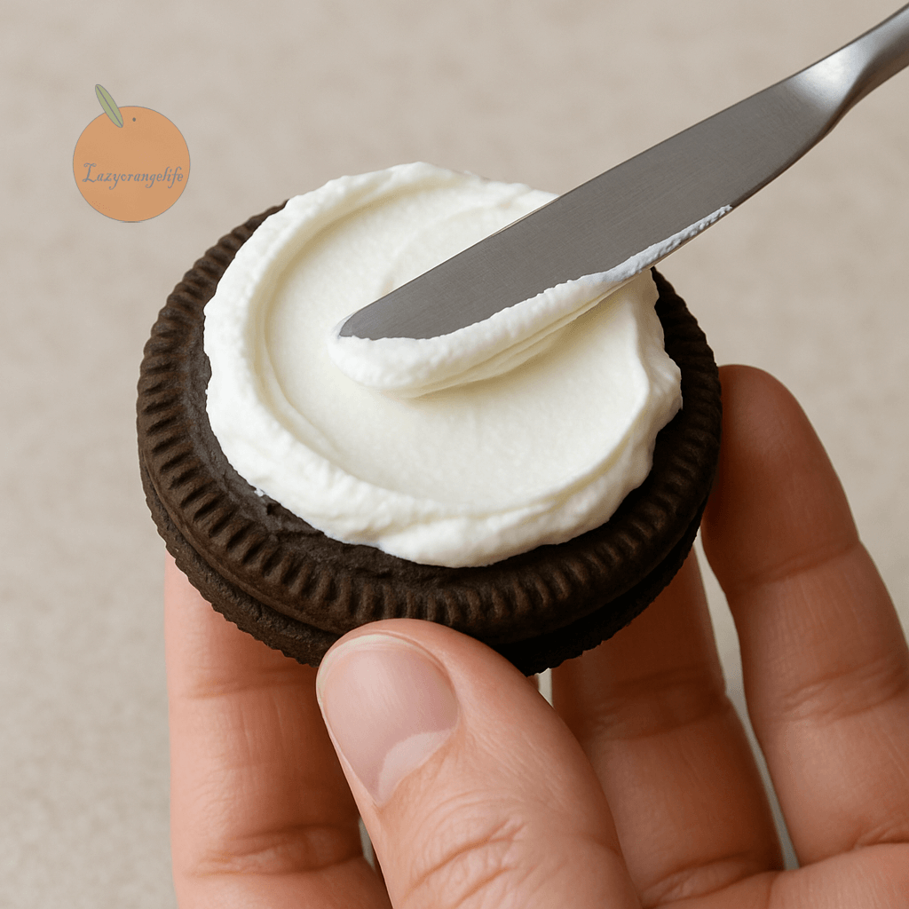 在餅乾上抹上一層打發好的鮮奶油,用湯匙或抹刀抹平。接著重複鋪一層Oreo、一層奶油,大約2~3層即可。