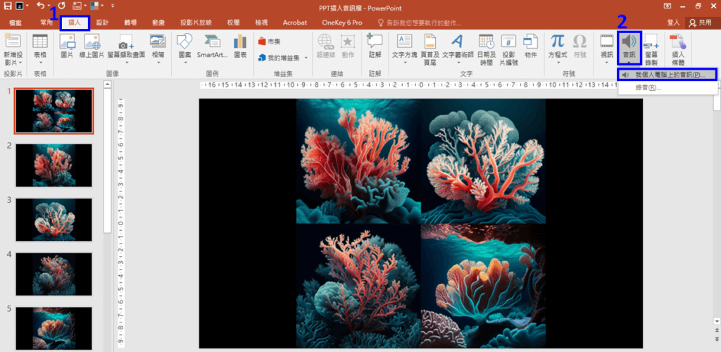 點選「插入」-「音訊」,可選擇「錄音」或「我個人電腦上的音訊」。