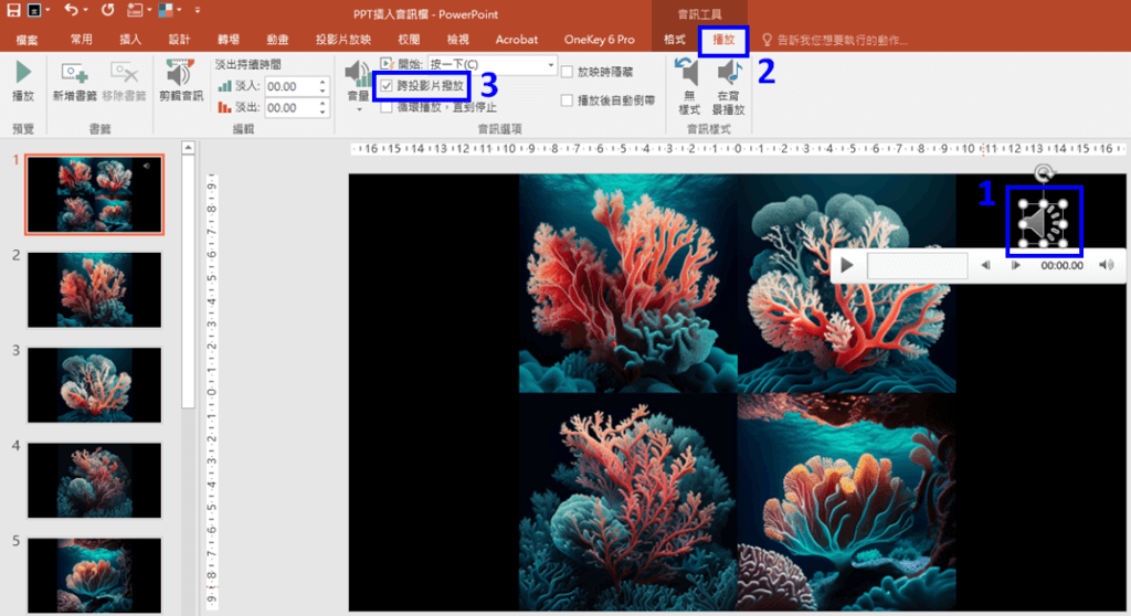 點選「音訊圖示」-「音訊工具」-「播放」-「跨投影片播放」。