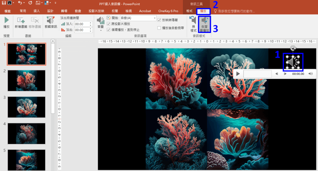 若想投影片放映時則自動播放音樂,不需要手動點擊播放,則是要勾選「背景播放」。