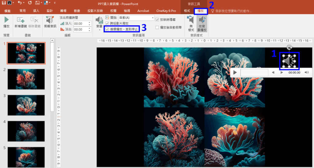點選「音訊圖示」-「音訊工具」-「播放」-「循環播放,直到停止」。