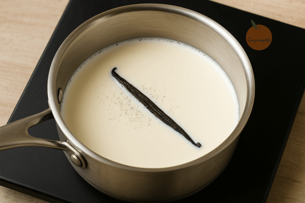 在小鍋中倒入鮮奶油,加入切開的香草莢(將香草籽刮出一起放入),小火加熱至邊緣微滾後關火,蓋上鍋蓋靜置5分鐘讓香草味釋放。