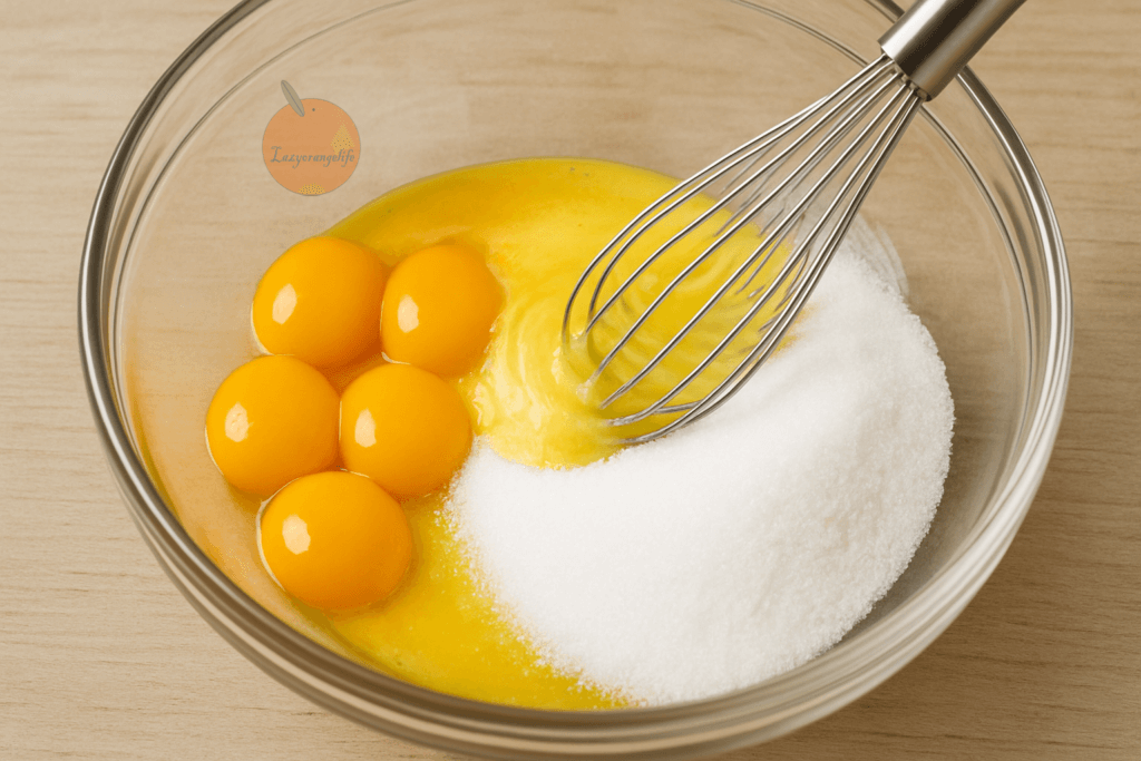 在碗中將蛋黃與砂糖攪拌至顏色稍變淺、質地滑順(不需打發)。