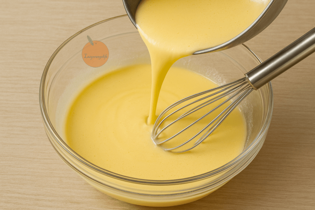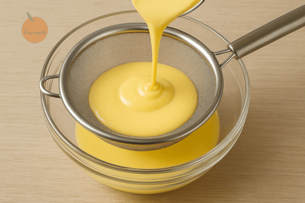 使用濾網將混合好的卡士達液過濾一次,確保口感細緻無顆粒。