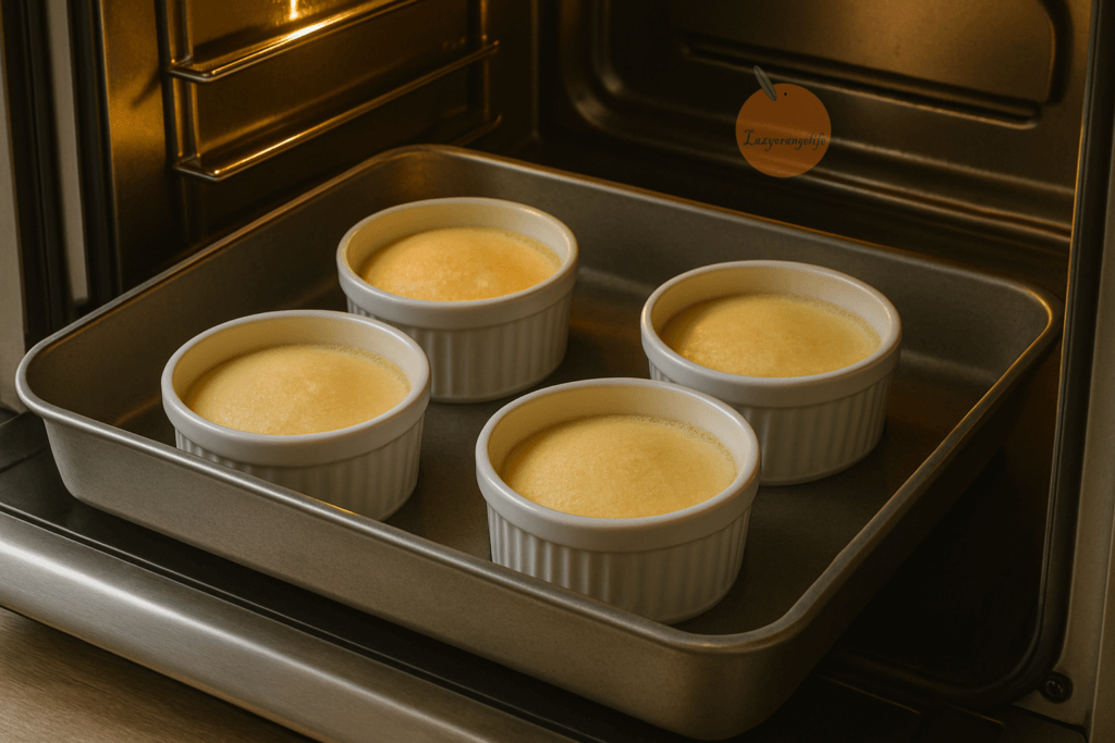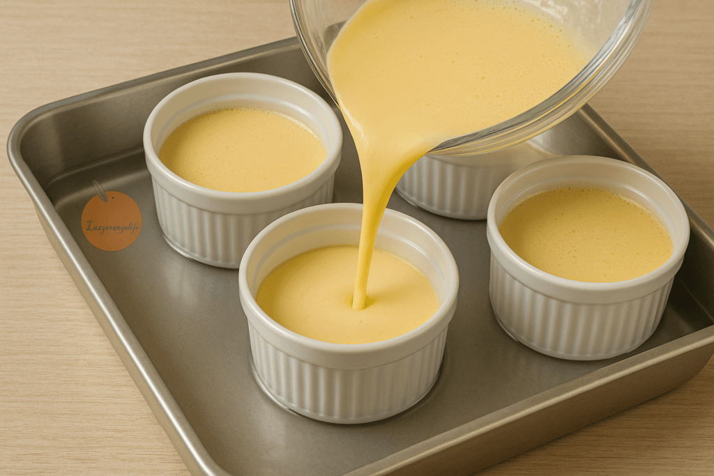 將卡士達液倒入小烤碗中(Ramekin),約8分滿。放入深烤盤中,倒入熱水至烤碗一半高度(隔水加熱法)。