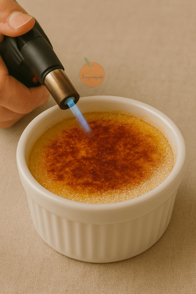 吃之前取出布蕾,灑上一層薄薄的砂糖,用噴槍燒至表面金黃酥脆(無噴槍可使用烤箱上火或火槍代替)。
